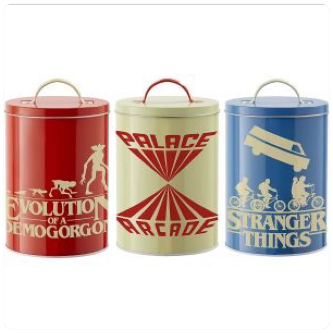Stranger Things Kitchen Storage Tins Silhouette design. 11 x 11 x 17cm Each tin, Stainless Steel body and lid, Hand wash only.